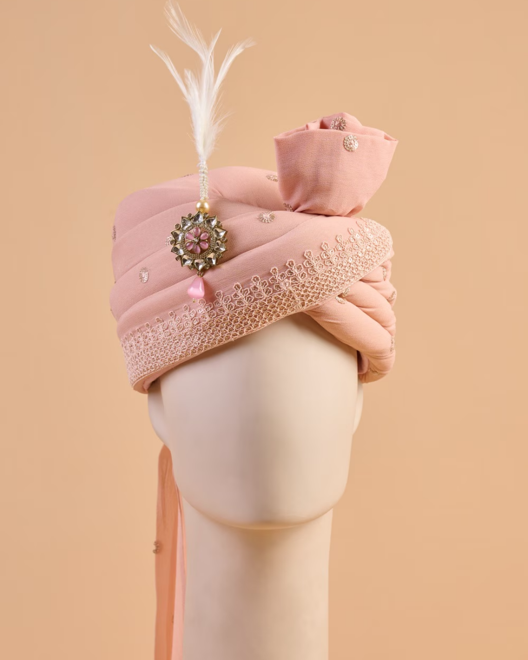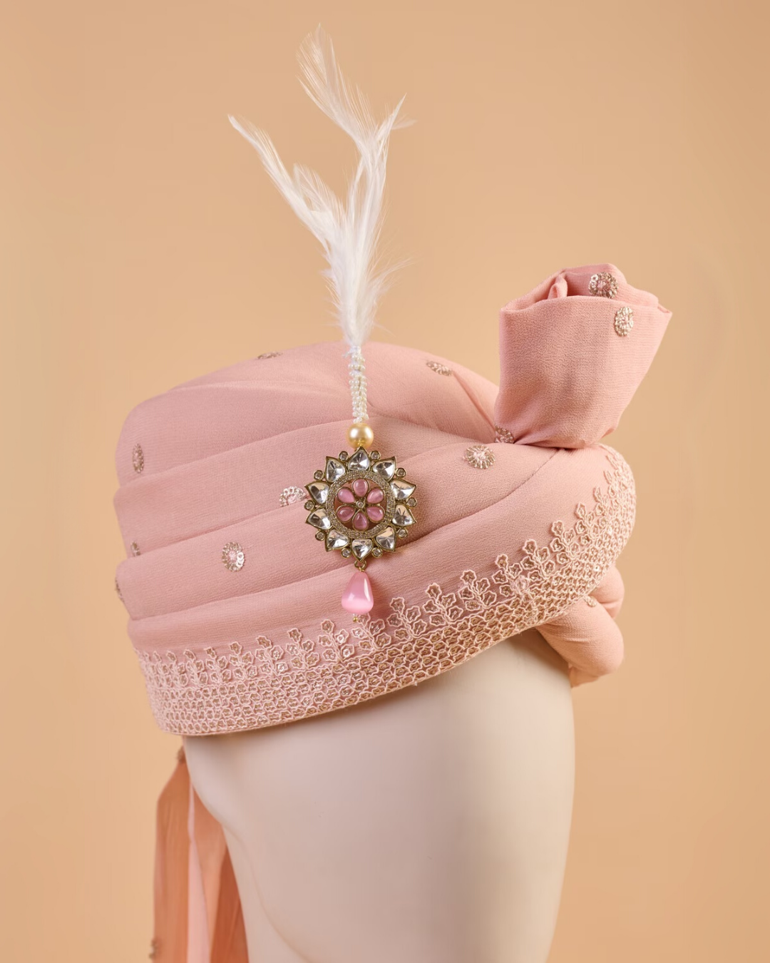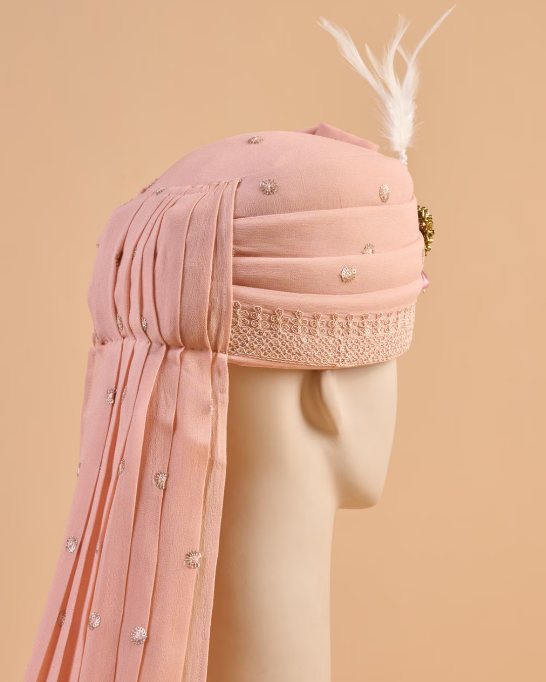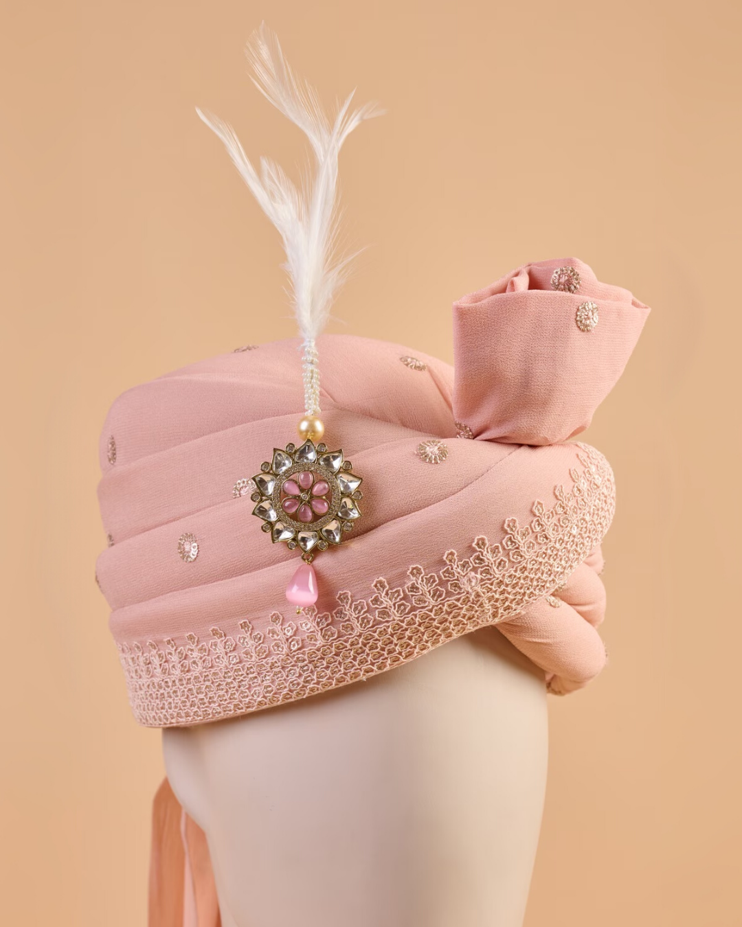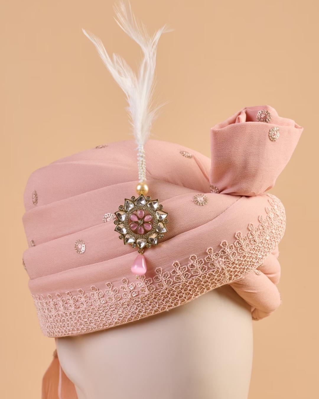 Blush Pink Feta Groom Safa Pagdi Turban with Brooch & Feather | Traditional Indian Wedding Accessory